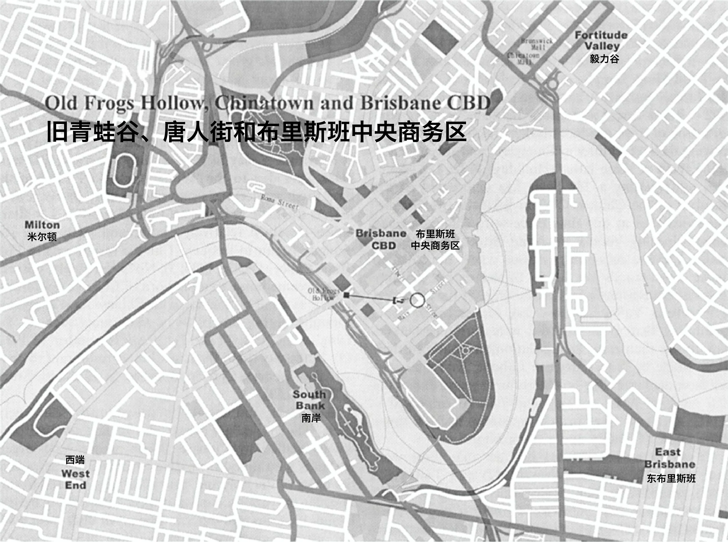 布里斯班的中国移民主要在布里斯班现在的市中心一个当时被称为Old Frog's Hollow的地区开展业务。这些华人商店、小企业和住宅被称为华人区。它们大多位于Charlotte Street和Mary Street之间的Albert Street北侧,并在拐角处延伸到Mary Street。